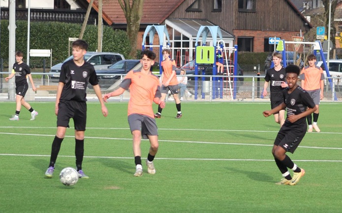 Foto (Connor Maaß): Paul Pietzer (links) und Abdi Ali (rechts) in den schwarzen Trikots waren mitverantwortlich für die gute Abwehrleistung der JSG Schlangen-Oesterholz-Kohlstädt.
